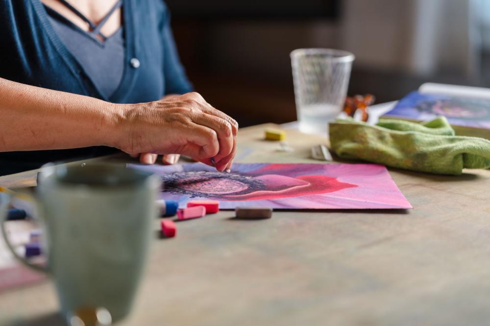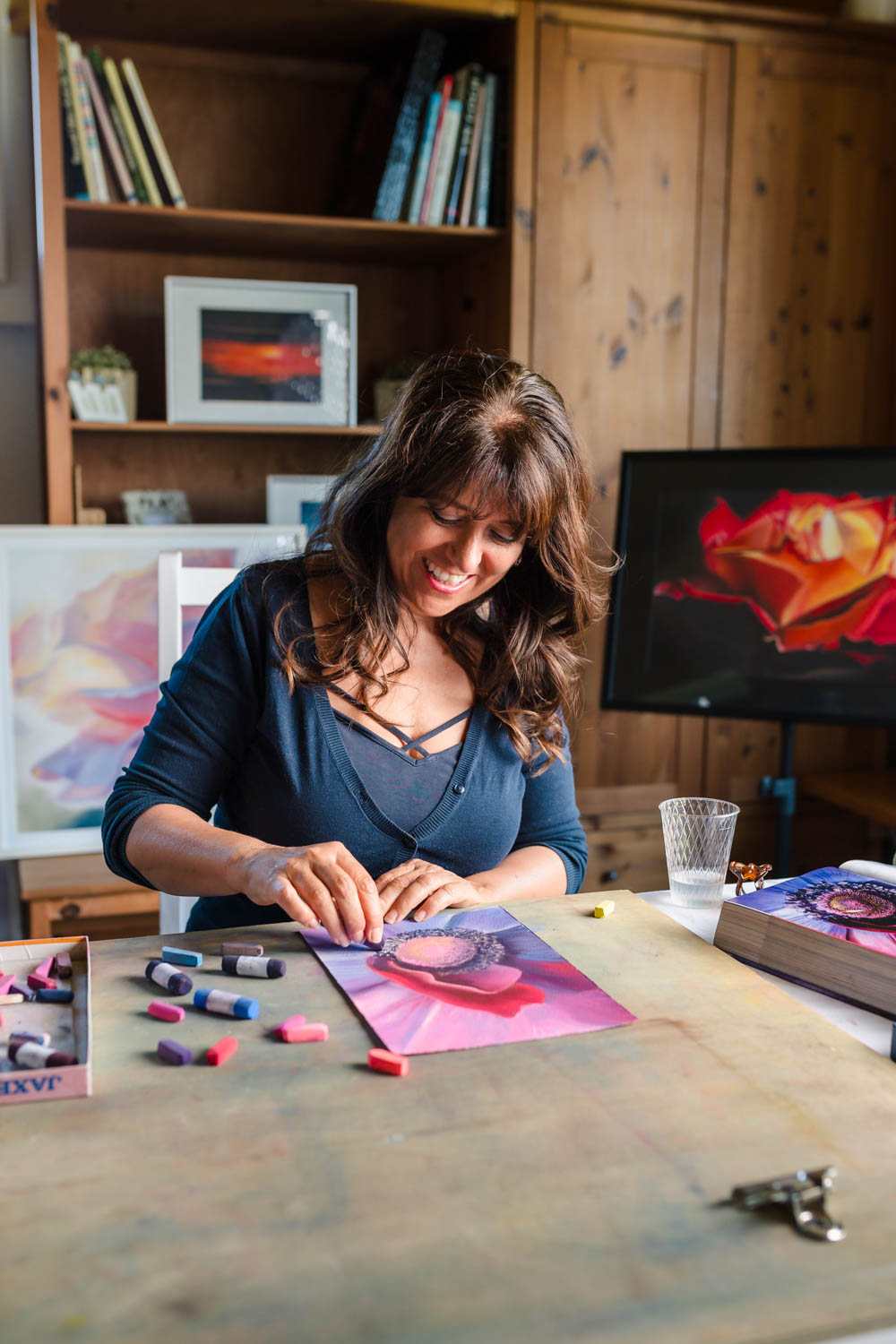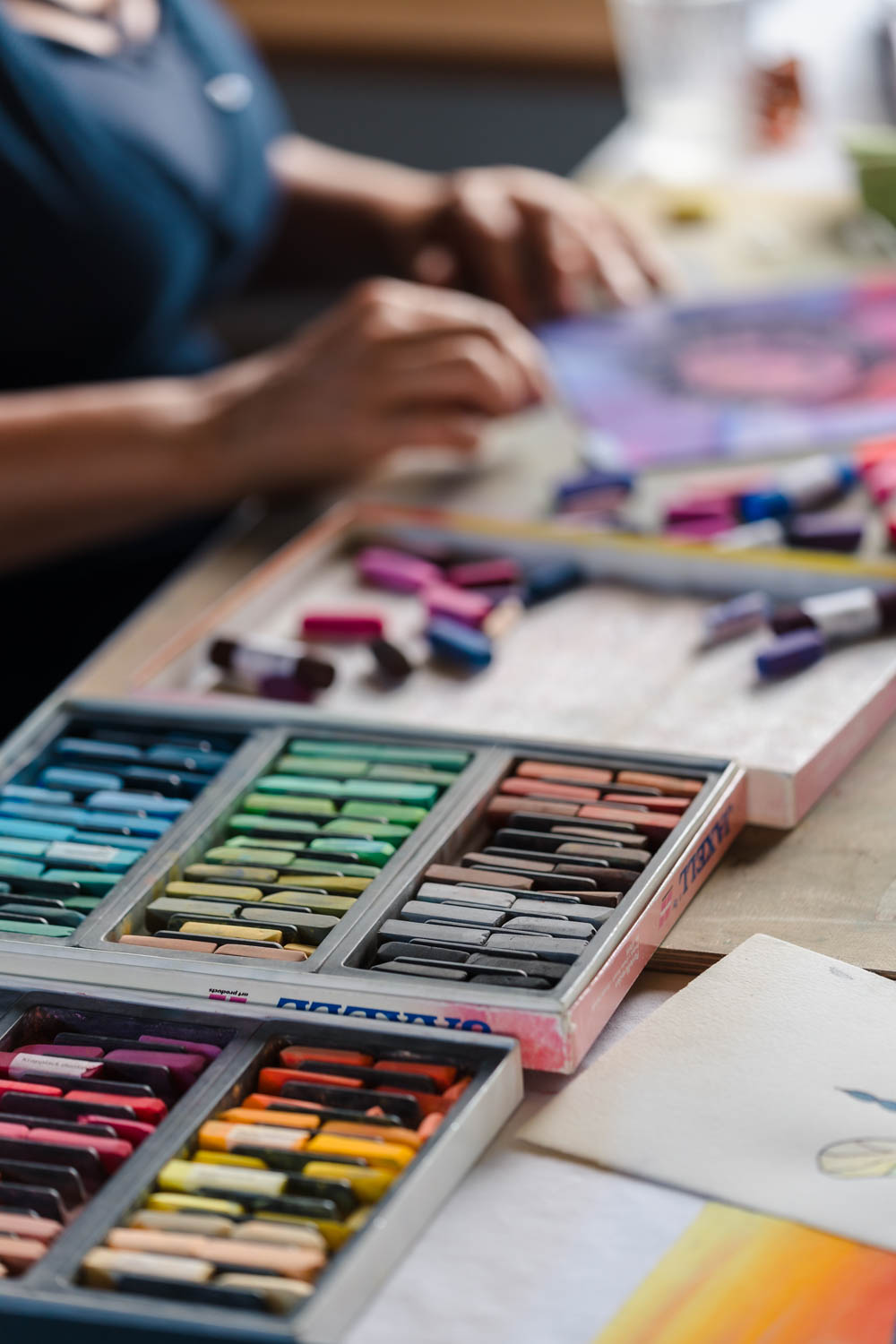 Marianne sieht die Welt durch eine besondere Linse. Wo viele von uns einfach nur einen blauen Himmel wahrnehmen, sieht sie eine Vielzahl von Farbnuancen, die in Harmonie zueinander stehen. Sie übersetzt diese komplexen Farben in lebendige Kunstwerke, indem sie ihre Finger als Werkzeug einsetzt. Während des Shootings erzählte sie mir, wie sie es liebt, die Kreide direkt mit ihren Händen zu formen und auf die Leinwand zu bringen – ein tiefes, physisches Erlebnis, das man in ihren Arbeiten spüren kann.